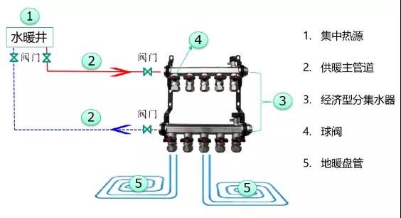经济型地暖系统图如下,该系统是北方集中供暖区域常见的地暖系统。